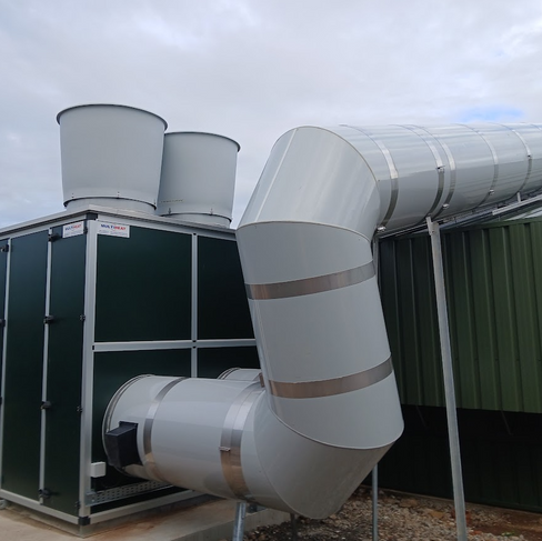 Heat is delivered into the houses through insulated ductwork, forming centrally into the building apex. Distribution fans are utilised to ensure even air movement throughout the shed.